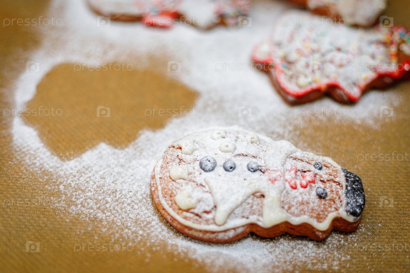 Рождественское печенье, посыпанное сахарной пудрой, на противне. Рождественская елка и снеговик в форме печенья