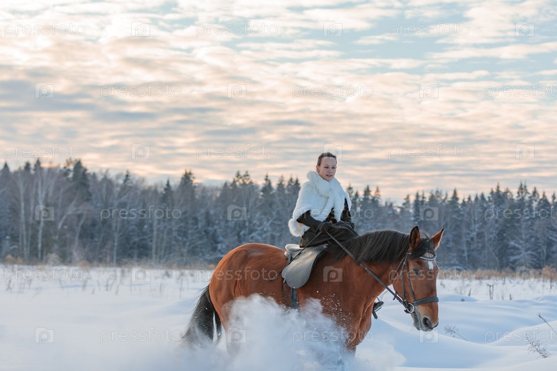 Девушка в белом плаще едет зимой на коричневой лошади. Золотой час, заходящее солнце