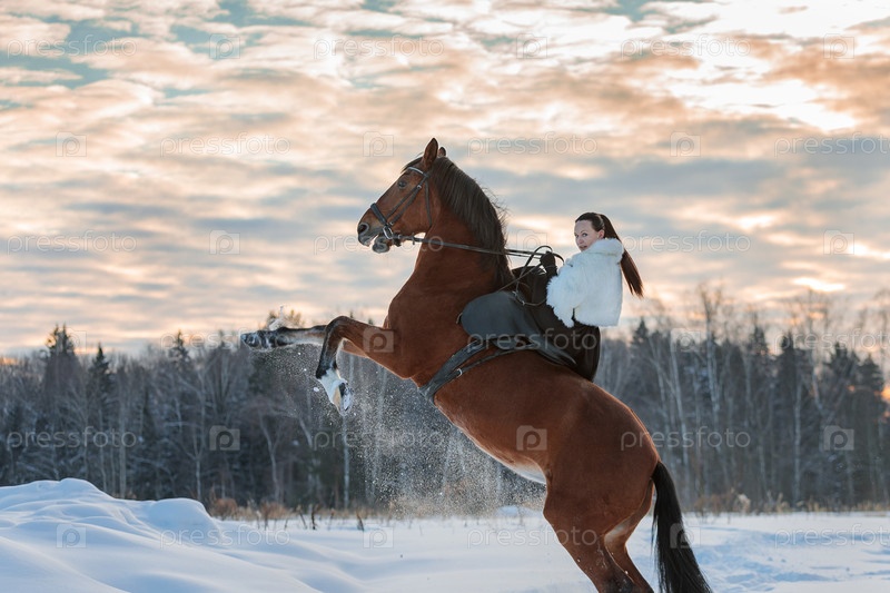 Девушка в белом плаще едет зимой на коричневой лошади. Золотой час, заходящее солнце. Лошадь встает