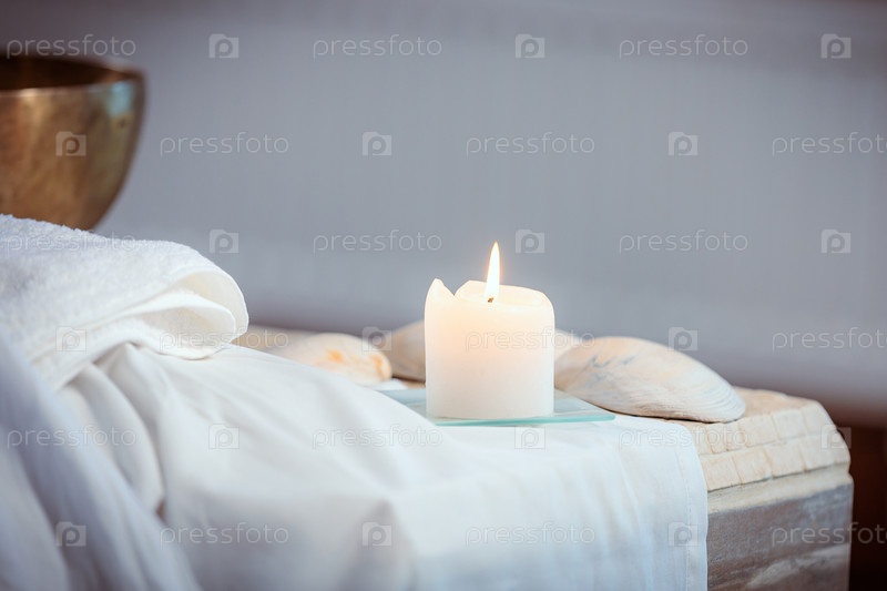 Горящая свеча со звуковой тибетской ритуальной чашей. звуковая терапия