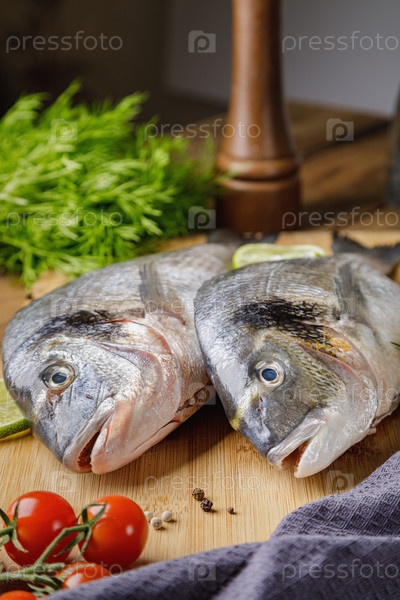 Свежая рыба дорадо, на деревянной доске, две головы крупным планом