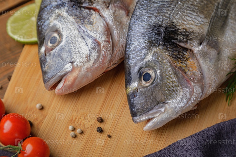 Сырая очищенная рыба дорадо с ингредиентами для приготовления пищи. Свежая рыба на деревянном фоне