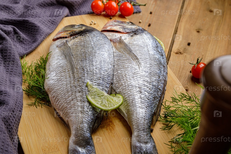 Сырая очищенная рыба дорадо с ингредиентами для приготовления пищи. Свежая рыба на деревянном фоне