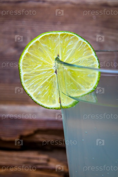 Стеклянный стакан с махито и лаймом на деревянном фоне