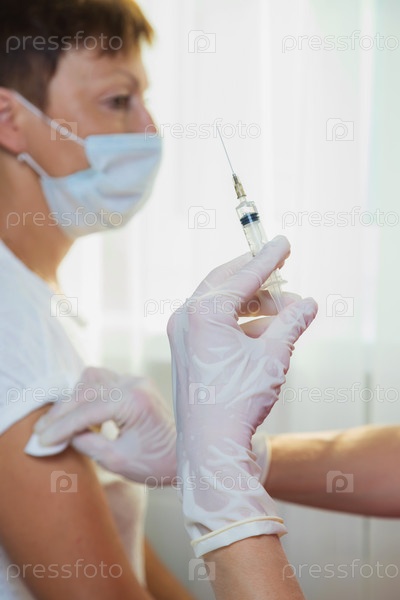 Девушка-врач в белых перчатках делает прививку, вакцину от коронавируса, гриппа