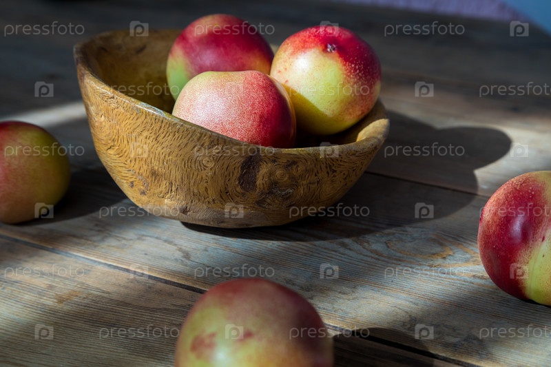 Красный и зеленый мини-нектарин в деревянной миске