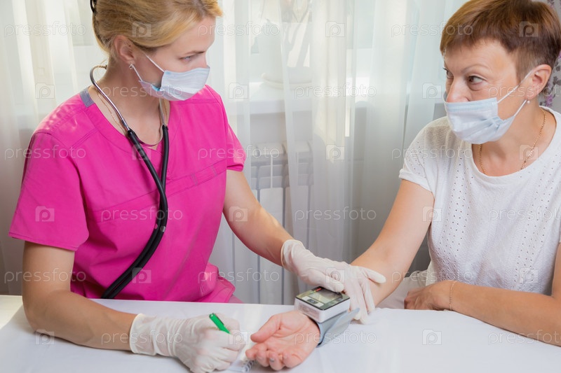 Девушка-врач измеряет артериальное давление взрослой женщины