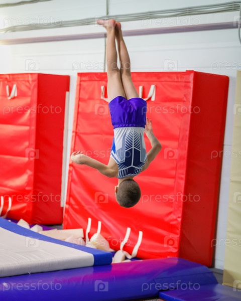 Молодой спортсмен выполняет сальто в прыжке в спортзале