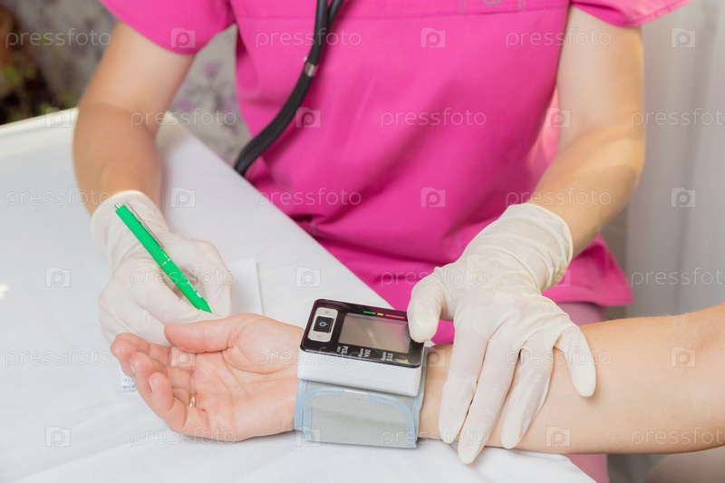 Девушка-врач измеряет артериальное давление взрослой женщины