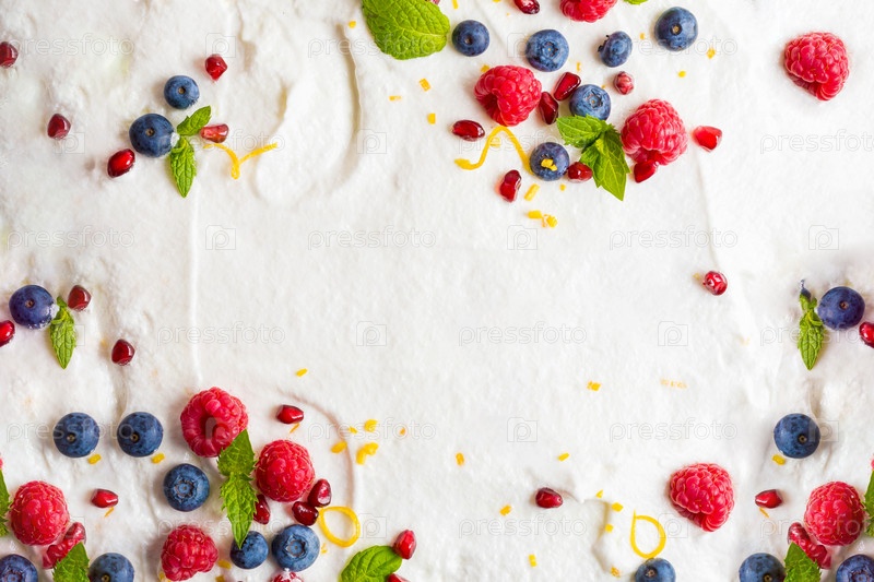 Взбитые сливки из яичных белков с малиной, черникой, гранатом. Композиция из ягод с местом для текста на белом фоне. Макет. Вид сверху