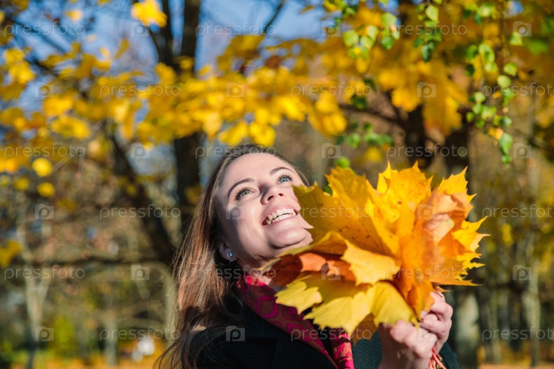 Женщина с длинными волосами радуется желтому букету листьев в осеннем парке. Осенний сезон