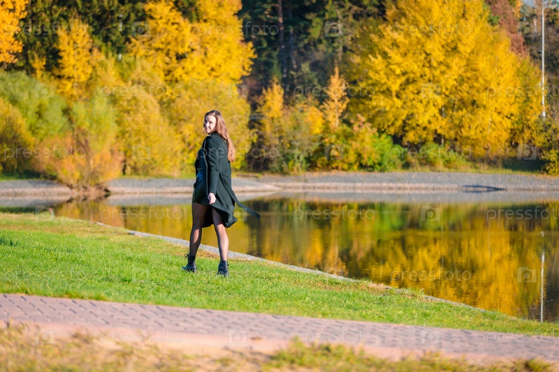 Женщина с длинными волосами гуляет в осеннем парке у пруда