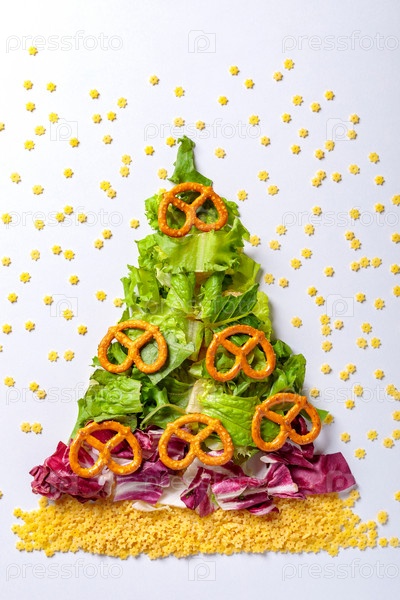 Рождественская елка из продуктов зеленого салата, капусты, сырых макарон и панировочных сухарей