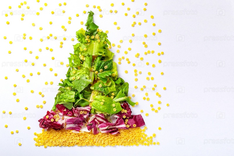 Рождественская елка из продуктов зеленого салата, капусты и сырых макарон. Место для текста