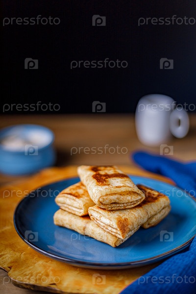 Блинчики с творожной начинкой на синей тарелке. Крупный план