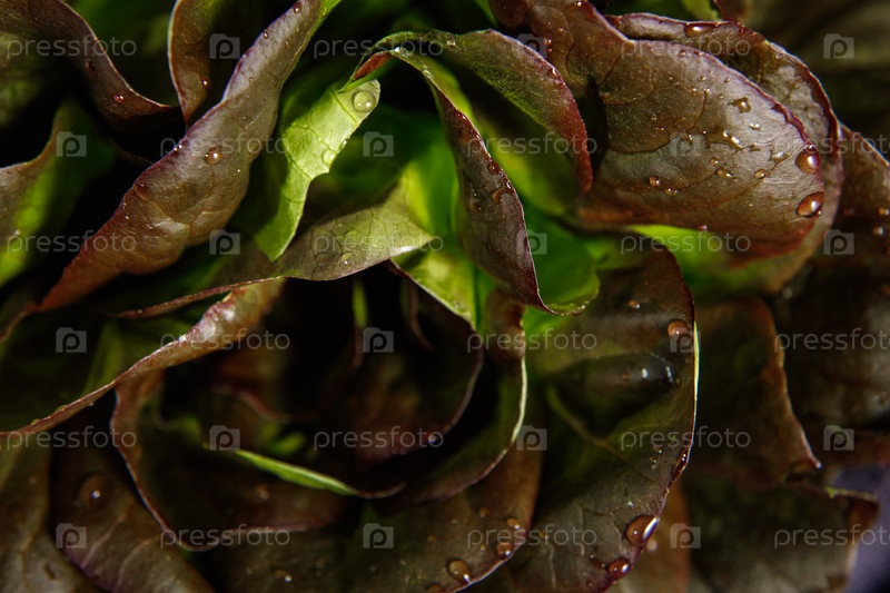 Куча свежих листьев салата на темном фоне. Крупный план