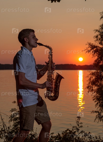 Молодой парень играет на саксофоне вечером на закате