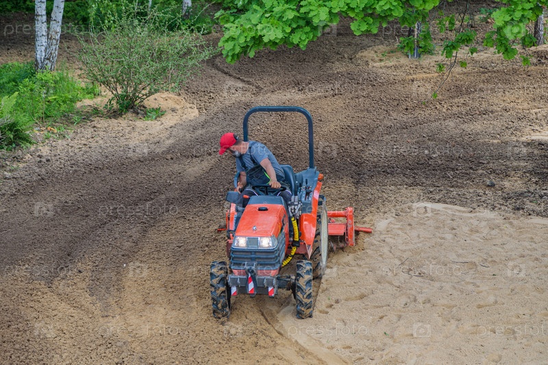 Фермер на минитракторе рыхлит почву для газона. Обработка земли, выравнивание поверхности
