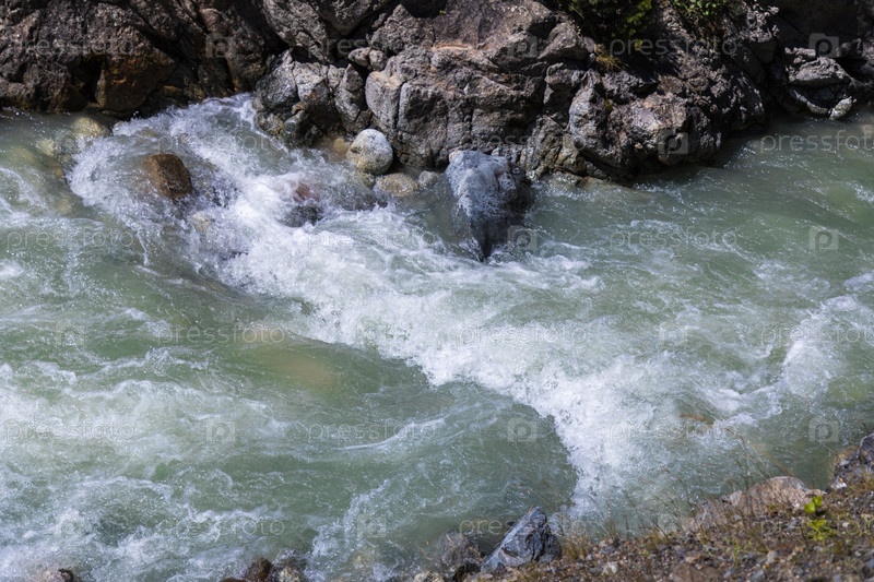 Горная река высоко в горах Северной Осетии. Бурное течение. Крупный план