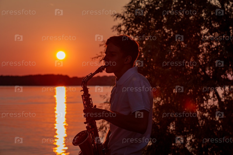 Молодой парень играет на саксофоне вечером на закате