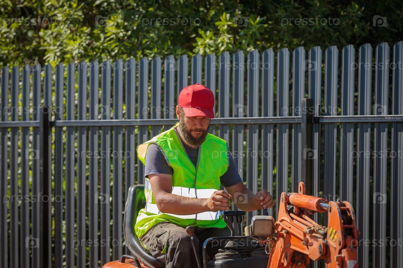 Мужчина на мини-экскаваторе разравнивает участок земли, рыхлит почву