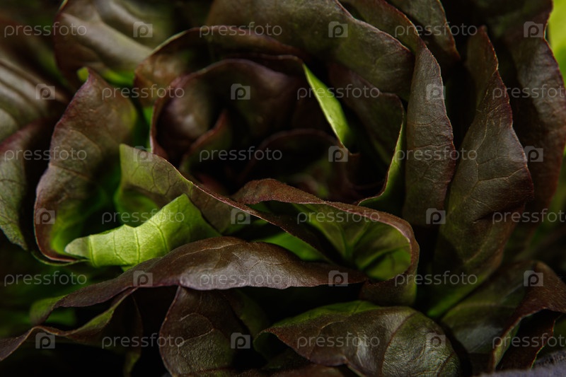 Куча свежих листьев салата на темном фоне. Крупный план