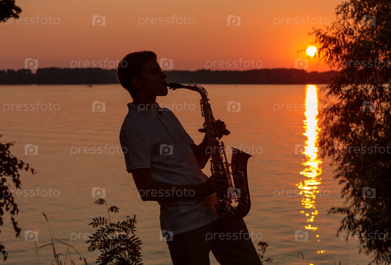 Молодой парень играет на саксофоне вечером на закате