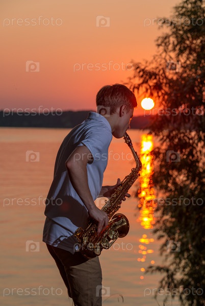 Молодой парень играет на саксофоне вечером на закате