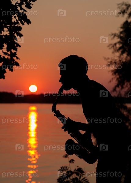 Силуэт молодого парня, играющего на саксофоне вечером на закате