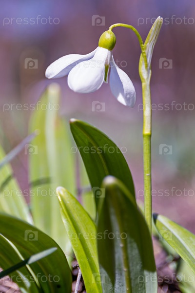 Подснежник - первый весенний цветок. Свежий зеленый белый ландыш, растущий в саду. Мартовский подснежник крупным планом