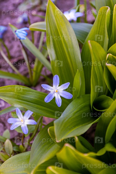 Примулы хионодокса. Общий вид цветущего растения, крупный план