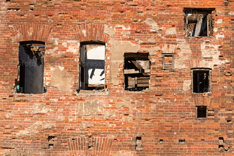Полуразрушенная стена старого двухэтажного кирпичного дома с окнами без рам. разруха и хаос, забвение