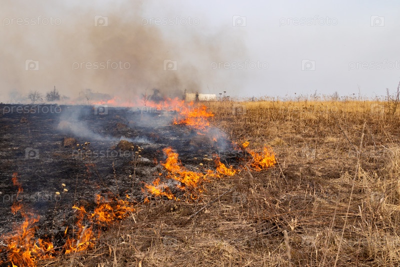Сухая трава горит весной на лугу в сельской местности. огонь уничтожает сухую траву. Оранжевое пламя и клубящийся дым. Опасность и стихийное бедствие. март 2020, Тульская область, Россия
