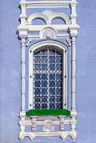 Окно на фасаде собора Успения Пресвятой Богородицы в Тульском Кремле, Россия. Русская достопримечательность. крупным планом