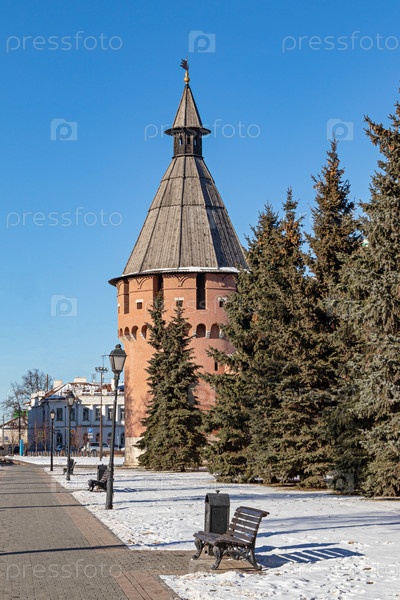 Памятник архитектуры Спасская башня в Тульском кремле, XVI век Россия Русская достопримечательность. зимний пейзаж