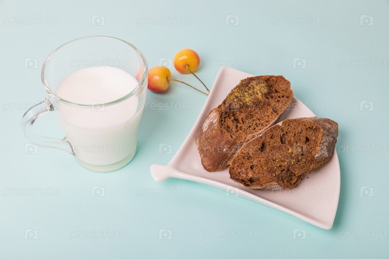 Кусочки ржаного хлеба на белой тарелке, рядом с кружкой с молоком на синем фоне