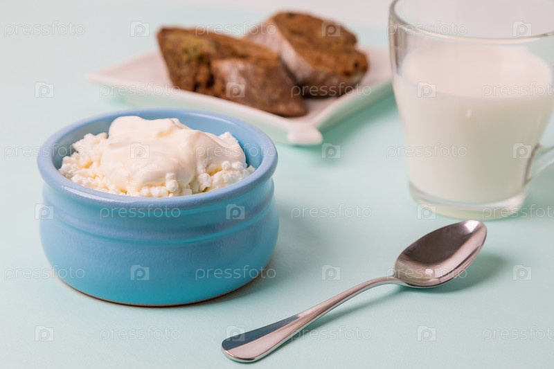 Творог в синей миске со сметаной и медом
