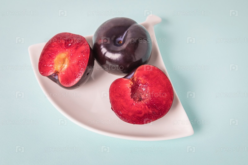 На белом блюдце большая слива, разрезанная пополам, а рядом целая слива
