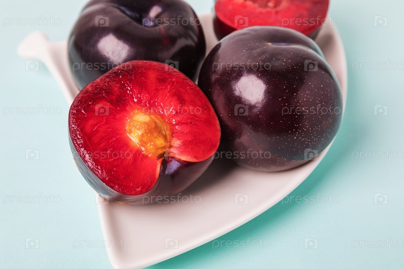 На белом блюдце большая слива, разрезанная пополам, а рядом целая слива