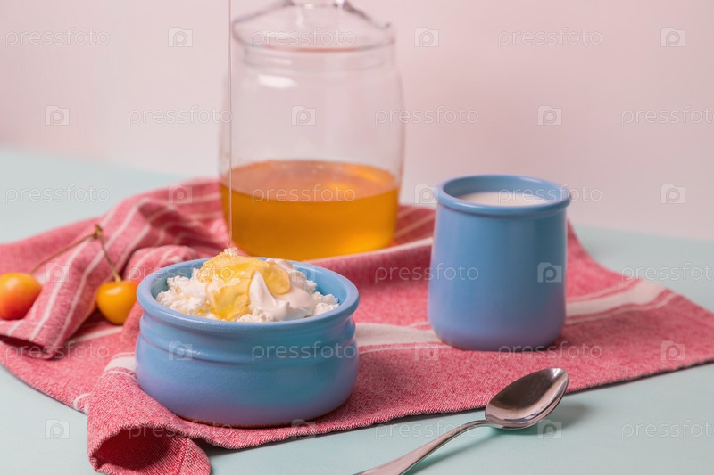 Творог в синей миске со сметаной и медом. Утренний завтрак