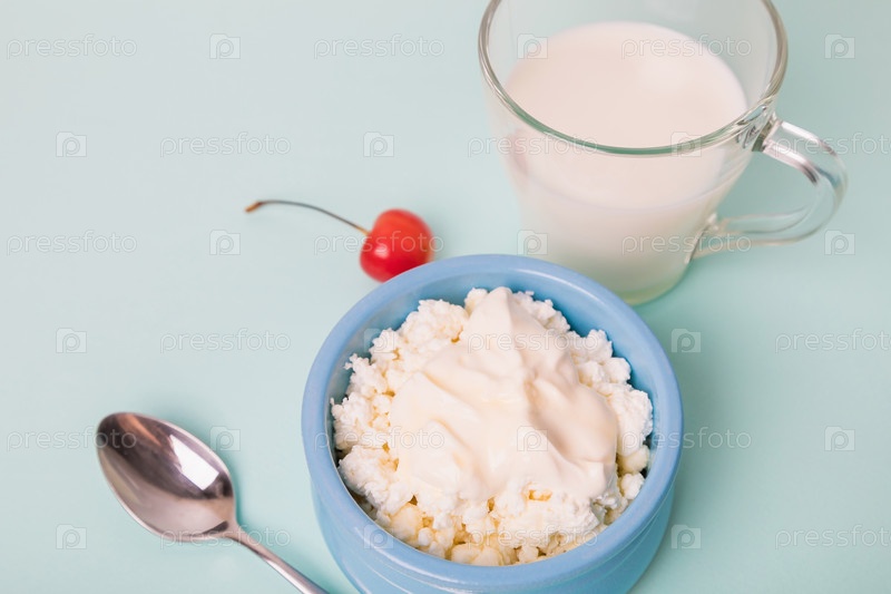 Творог в синей миске со сметаной и медом, чашка с молоком