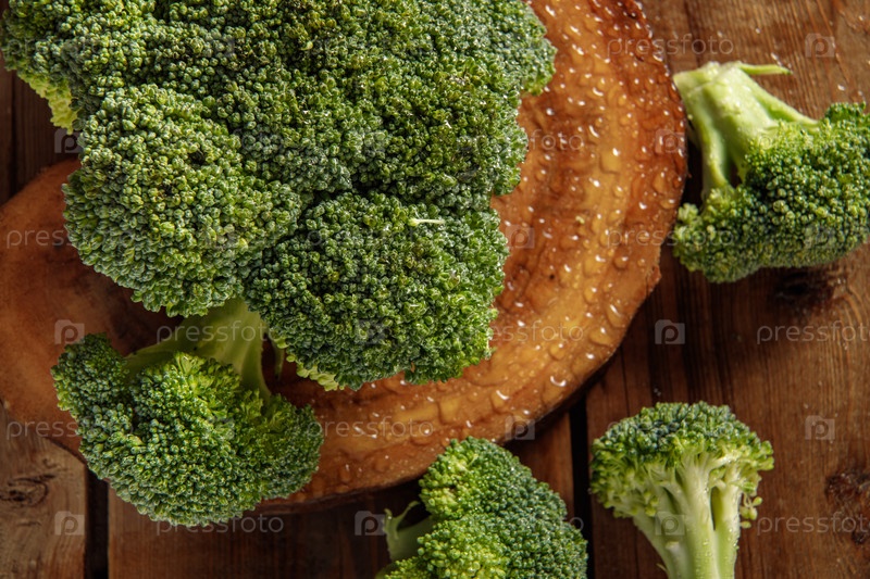 Сырые зеленые соцветия брокколи на деревянной доске с ингредиентами. Крупный план