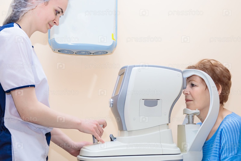 Девушка-оптометрист осматривает глаза пациента с помощью специального современного оборудования