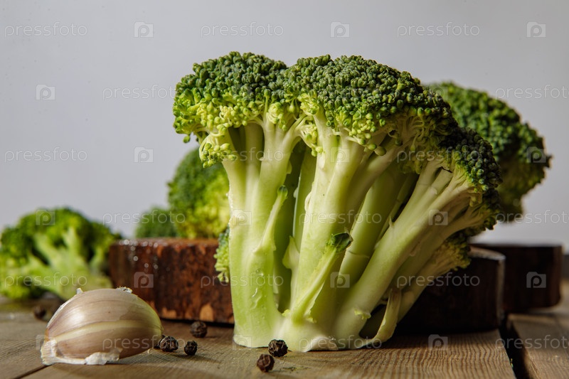 Сырые зеленые соцветия брокколи на деревянной доске с ингредиентами. Крупный план