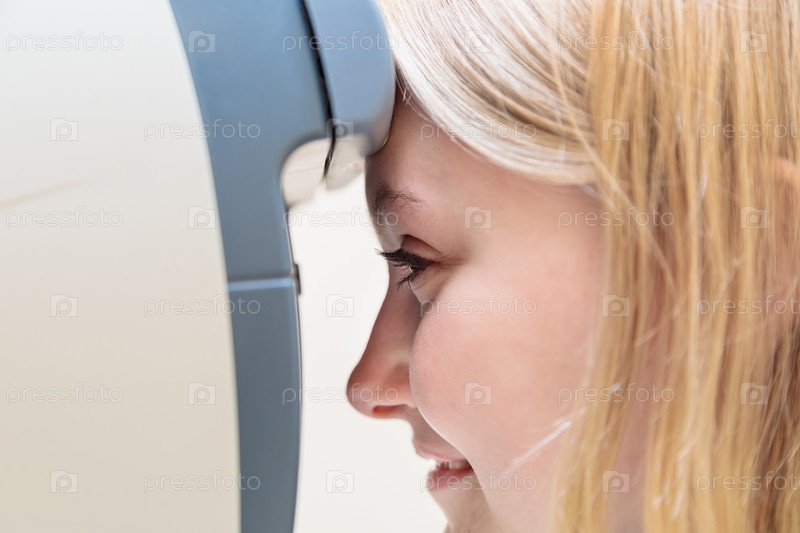 Девушка-оптометрист осматривает глаза пациента с помощью специального современного оборудования