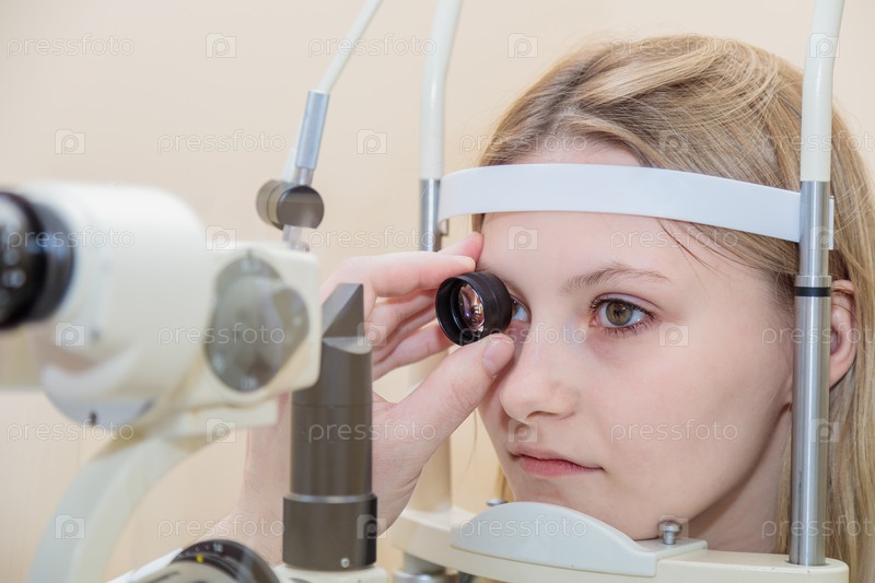 Мужчина-офтальмолог проверяет зрение молодой девушки с помощью современного устройства со световым лучом