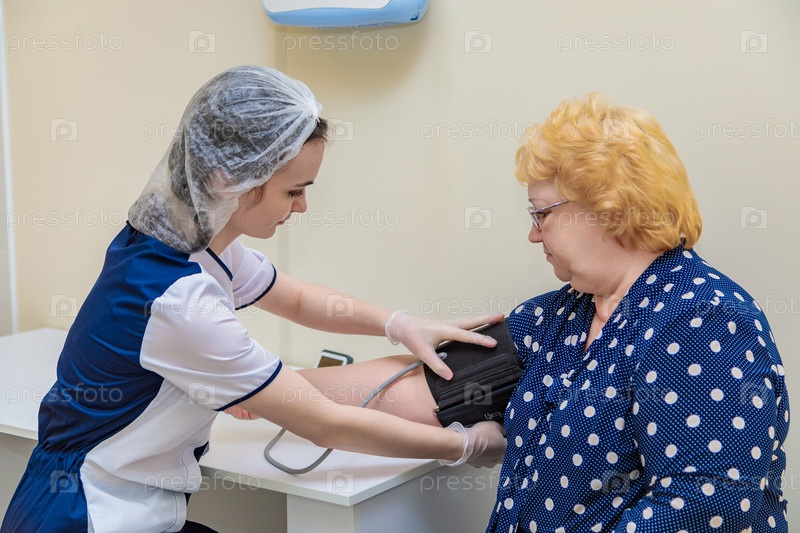 Медсестра в поликлинике измеряет артериальное давление женщине с помощью прибора. Здравоохранение