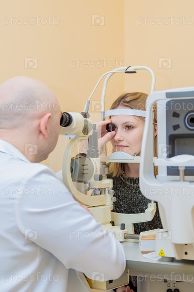 Мужчина-офтальмолог проверяет зрение молодой девушки с помощью современного устройства со световым лучом