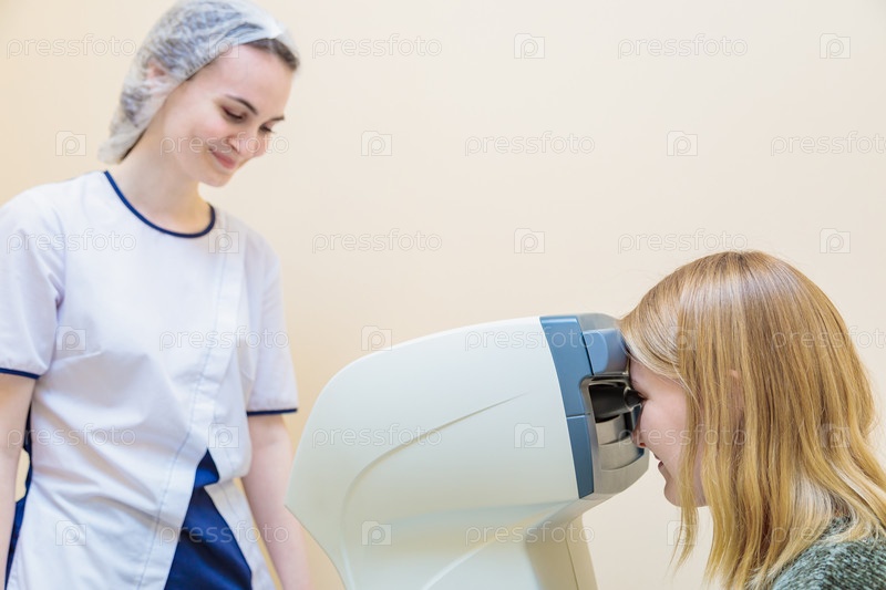 Девушка-оптометрист осматривает глаза пациента с помощью специального современного оборудования
