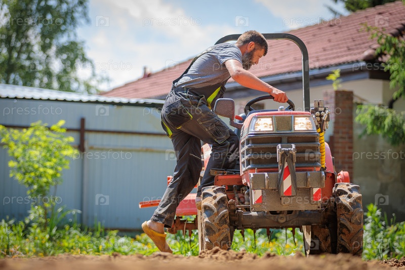 Мужчина на мини-тракторе выравнивает участок земли, рыхлит почву